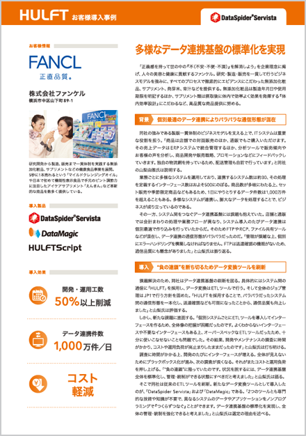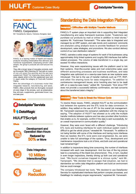 研究から製造、販売、お客様対応までを一貫して行い、化粧品・健康食品メーカーとして成長を続けるファンケル。多岐にわたる商品展開と販売戦略を支える上で重要な役割を担うのが、多様なシステム間をつなぐデータ連携基盤である。その標準化を目指し、同社が採用したのが「DataSpider Servista」および「DataMagic」だ。これにより基盤全体の管理・統制が強化され、開発・運用工数を50%以上削減。事業部門の要請にも迅速に対応できるようになり、ビジネスのスピードアップにもつながっている。