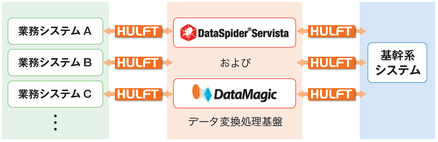 システム間の通信をHULFTで一本化するとともに、データ変換処理は用途に応じてDataSpider ServistaとDataMagicを使い分け、