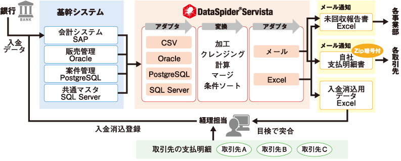 DataSpiderが、入金消込業務の効率化に加え、未回収報告書の自動作成や自社支払明細のメール配信も実現しました。
