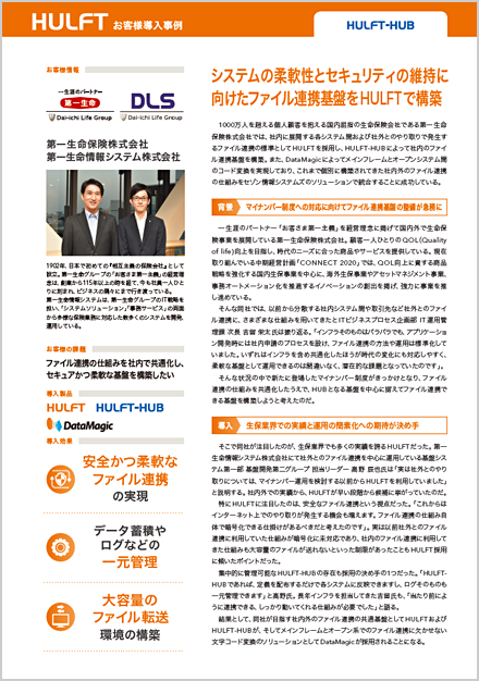 1000万人を超える個人顧客を抱える国内屈指の生命保険会社である第一生命保険株式会社では、社内に展開する各システム間および社外とのやり取りで発生するファイル連携の標準としてHULFTを採用し、HULFT-HUBによって社内のファイル連携基盤を構築。また、DataMagicによってメインフレームとオープンシステム間のコード変換を実現しており、これまで個別に構築されてきた社内外のファイル連携の仕組みをセゾン情報システムズ(現セゾンテクノロジー)のソリューションで統合することに成功している。