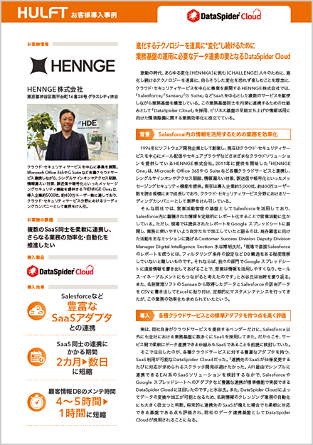 激動の時代、あらゆる変化(HENNKA)に挑む(CHALLENGE)人々のために、進化し続けるテクノロジーを道具に、自らそうした変化を恐れず楽しむことを理念に、クラウド・セキュリティサービスを中心に事業を展開するHENNGE株式会社では、「Salesforce」「Sansan」「G Suite」などSaaSを中心とした複数のサービスを駆使しながら業務基盤を構築している。この業務基盤同士を円滑に連携するための仕組みとして「DataSpider Cloud」を採用、ビジネス基盤の早期立ち上げや情報活用に向けた環境整備に関する業務効率化に役立てている。