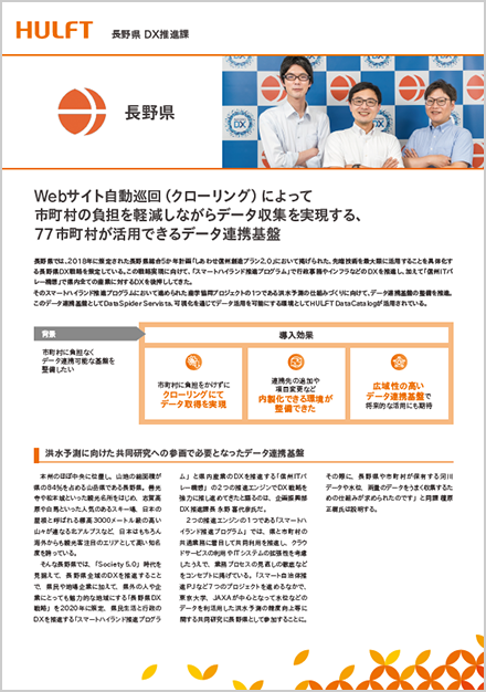 今回実施した長野県スマートハイランドデータ連携基盤構築事業では、DataSpider Servistaを中心にデータ連携基盤を構築し、HULFT DataCatalogにて蓄積された情報のメタデータを自動収集してカタログ化することで、情報の可視化を実現している。2023年4月から運用を開始しており、県が管理する10サイトと市町村側の8つのWebサイトから水位、雨量や積雪量などの情報をクローリングによって定期的に取得。