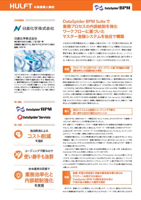 日本初の化学肥料製造会社として創業した総合化学メーカーの日産化学株式会社。同社は内部統制の強化を目指して、マスター情報の登録システムの構築にDataSpider BPM Suiteを採用。従来は煩雑で業務フローが明確でなかったマスター情報の登録・更新作業を、適切な承認フローに基づいて自動化することに成功しました。コーディング不要なDataSpider BPM Suiteにより、自社スタッフの独自開発を成し遂げた同社では、今後さらに、他のさまざまな業務フローに対してもBPMを活用していく方針です。