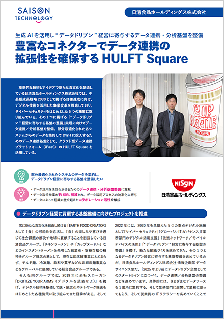 革新的な技術とアイデアで新たな食文化を創造している日清食品ホールディングス株式会社では、中長期成長戦略2030として掲げる目標達成に向け、デジタル技術を活用した事業変革を推進しており、サイバーセキュリティをはじめとした5つの施策に取り組んでいる。その1つに掲げる「“データドリブン”経営に寄与する基盤の整備」実現に向けてデータ連携/分析基盤を整備。部分最適化された各システムからのデータを集約してDWHに投入するためのデータ連携基盤として、クラウド型データ連携プラットフォーム(iPaaS)のHULFT Squareを活用している。