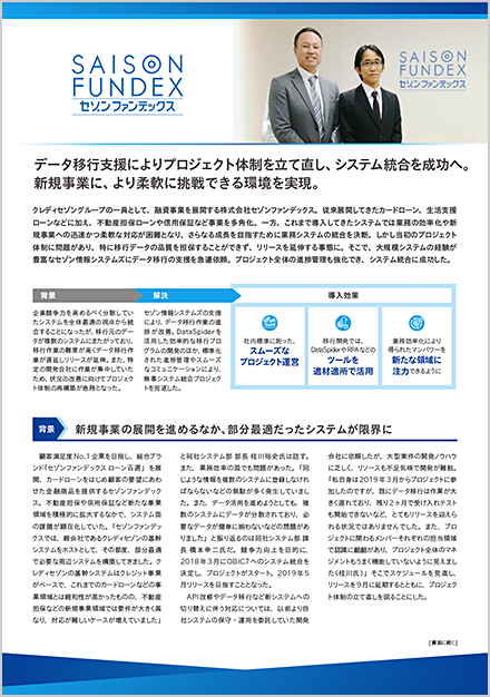 今回のプロジェクトでは、オービック社によるOBIC7本体の開発とは別に、①移行先のOBIC7の帳票開発、②連携先システムのAPI改修、③データ移行がセゾンファンデック スのタスクであった。2019年3月時点で①~③のすべてが、自社システムの保守・運用を委託している開発会社に集中していたため、リスク分散も兼ねて未着手だった2システムのデータ移行をセゾン情報システムズ(現セゾンテクノロジー)のフィナンシャルITサービスビジネスユニットへ依頼。「クレディセゾンの次期システム移行にも関わっていたセゾン情報システムズ(現セゾンテクノロジー)には、以前から経験に基づいたアドバイスをいただいていました。またデータ連携ツール『DataSpider』を用いたデータ移行やRPA活用などにも豊富なノウハウがあったため依頼しました(桂川氏)」