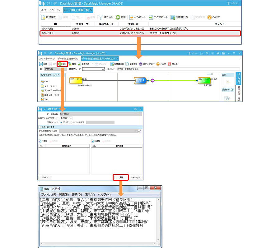 手順2において登録したSAMPLE2というデータ加工情報IDをダブルクリックし、入力設定および出力設定のファイル名が正しく設定されていることを確認します。画面から、SAMPLE2のデータ加工情報IDを開き、画面上部にある「実行」ボタンから行います。実行が完了すると、出力設定において指定されたC:\work\SAMPLE2\に“out”というファイルが出来ているのでメモ帳等のエディタで確認して下さい。