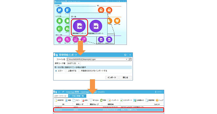 DataMagicの管理画面を起動し、ダウンロードしたスクリプトファイルをDataMagicに取り込みます。取り込みはスタート画面の[ツール]にある[管理情報インポート]アイコンをクリックします。管理情報インポート画面においてダウンロードしたファイルを指定し、インポートボタンをクリックします。取り込みが成功すると、データ加工情報一覧画面にSAMPLE2というIDが登録されます。