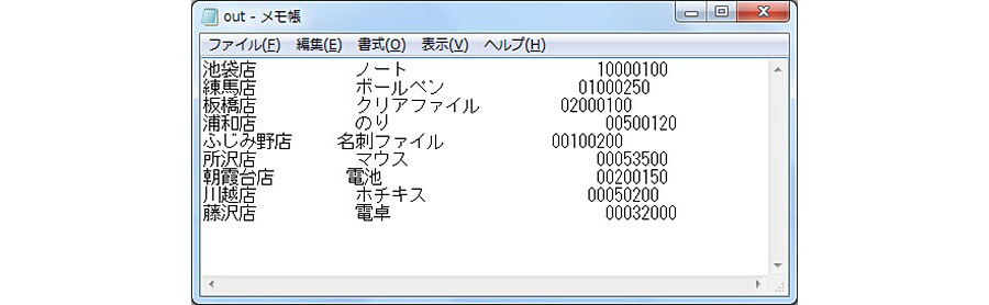 手順3において実行が完了すると、出力設定において指定されたC:\work\SAMPLE3\に“out”というファイルが出来ているのでメモ帳等のエディタで確認して下さい。