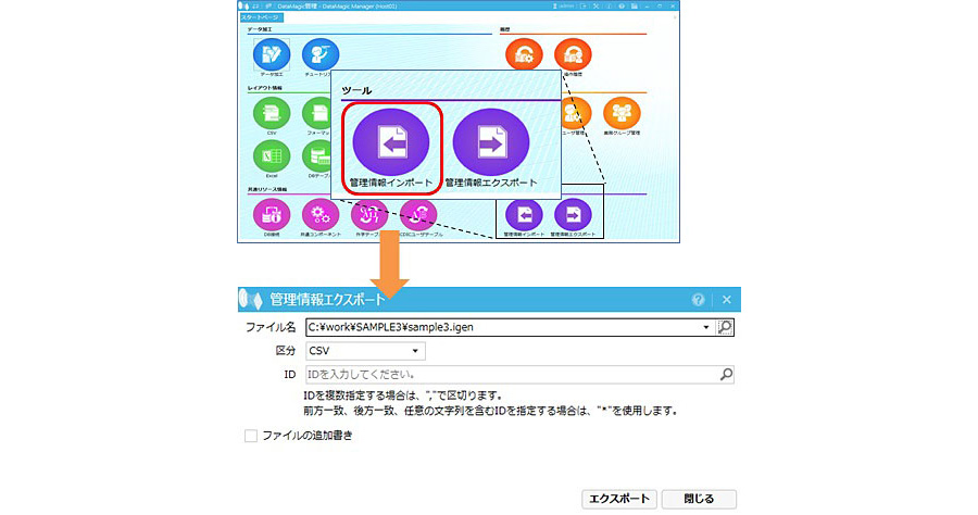 DataMagicの管理画面を起動し、ダウンロードしたスクリプトファイルをDataMagicに取り込みます。取り込みはスタート画面の[ツール]にある[管理情報インポート]アイコンをクリックします。管理情報インポート画面においてダウンロードしたファイルを指定し、インポートボタンをクリックします。取り込みが成功すると、データ加工情報一覧画面にSAMPLE3というIDが登録されます。