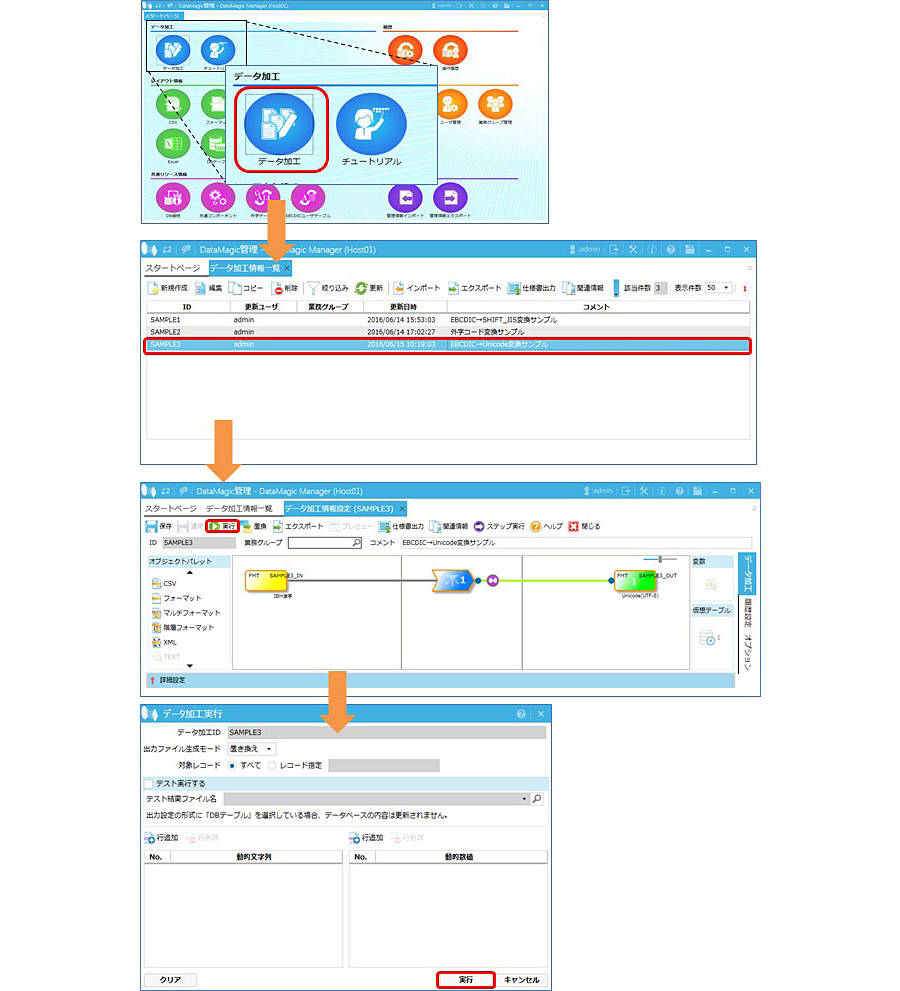 手順2において登録したSAMPLE3というデータ加工情報IDをダブルクリックし、入力設定および出力設定のファイル名が正しく設定されていることを確認します。画面から、SAMPLE3のデータ加工情報IDを開き、画面上部にある「実行」ボタンから行います。
