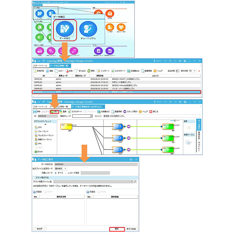 手順2において登録したSAMPLE5というデータ加工情報IDをダブルクリックし、入力設定および出力設定のファイル名が正しく設定されていることを確認します。画面から、SAMPLE5のデータ加工情報IDを開き、画面上部にある「実行」ボタンから行います。