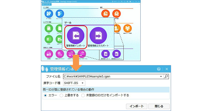 DataMagic の管理画面を起動し、ダウンロードしたスクリプトファイルをDataMagicに取り込みます。取り込みはスタート画面の[ツール]にある[管理情報インポート]アイコンをクリックします。管理情報インポート画面においてダウンロードしたファイルを指定し、インポートボタンをクリックします。取り込みが成功すると、データ加工情報一覧画面にSAMPLE5というIDが登録されます。