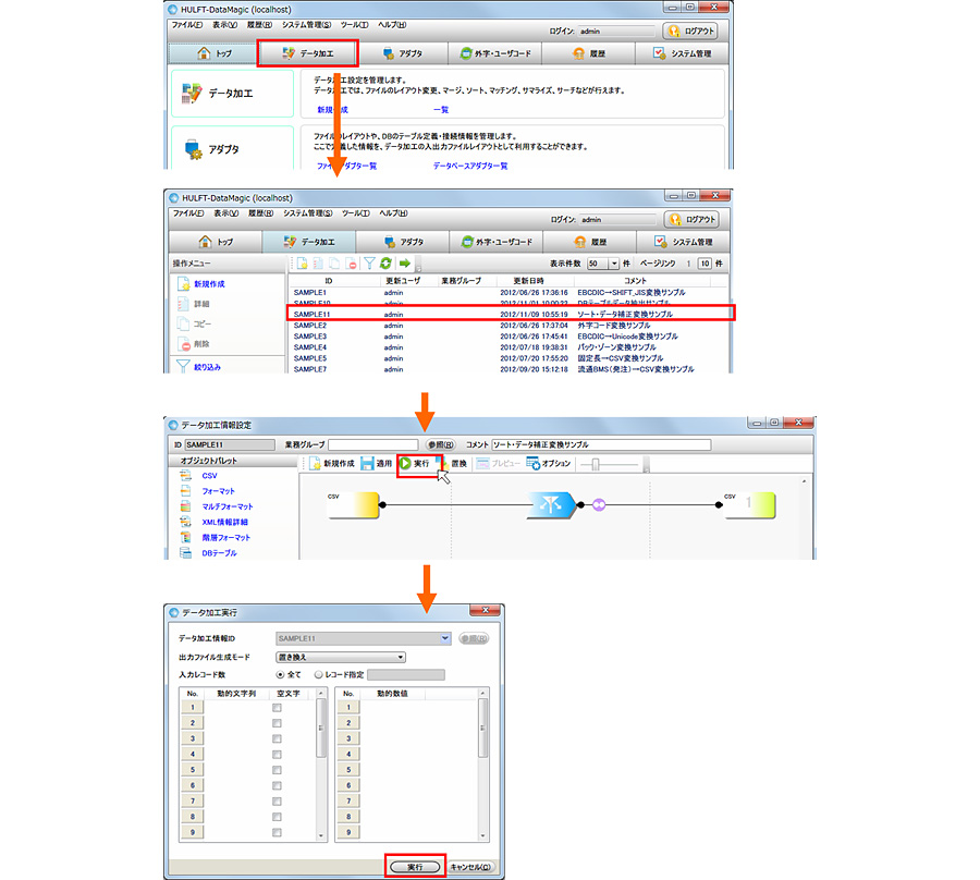 手順2において登録したSAMPLE11というデータ加工情報IDをダブルクリックし、入力設定および出力設定のファイル名が正しく設定されていることを確認します。画面から、SAMPLE11のデータ加工情報IDを開き、画面上部にある「実行」ボタンから行います。