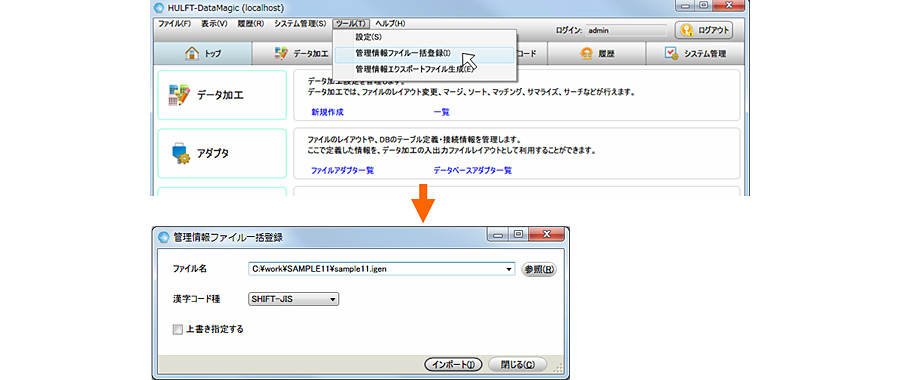 DataMagic の管理画面を起動し、ダウンロードしたスクリプトファイルをDataMagicに取り込みます。取り込みはファイルメニューの[ツール]→[管理情報ファイル一括登録]を選択します。管理情報ファイル一括登録画面においてダウンロードしたファイルを指定し、インポートボタンを押下します。取り込みが成功すると、データ加工情報一覧画面にSAMPLE11というIDが登録されます。