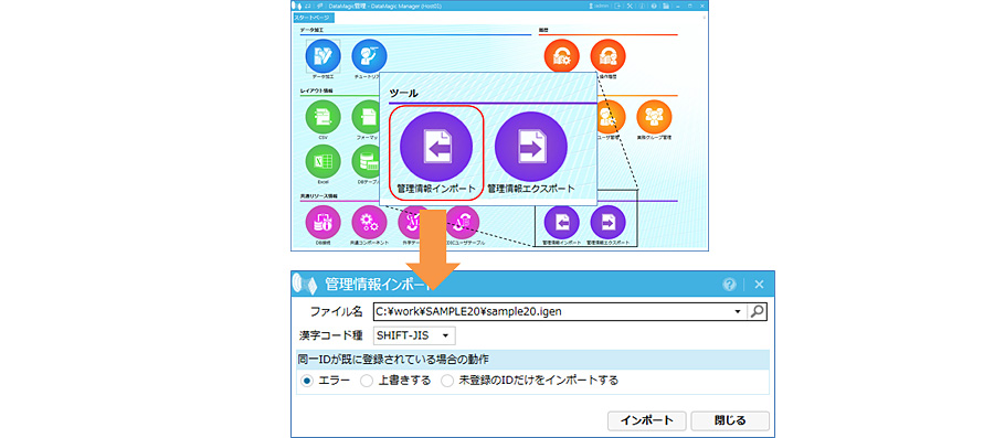 DataMagic の管理画面を起動し、ダウンロードしたスクリプトファイルをDataMagicに取り込みます。取り込みはスタート画面の[ツール]にある[管理情報インポート]アイコンをクリックします。管理情報インポート画面においてダウンロードしたファイルを指定し、インポートボタンをクリックします。すると、データ加工情報一覧画面にSAMPLE20というIDが登録されます。