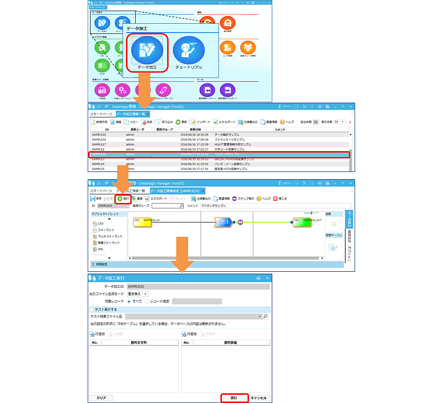 手順2において登録したSAMPLE20というデータ加工情報IDをダブルクリックし、入力設定および出力設定のファイル名が正しく設定されていることを確認します。画面から、SAMPLE20のデータ加工情報IDを開き、画面上部にある「実行」ボタンから行います。