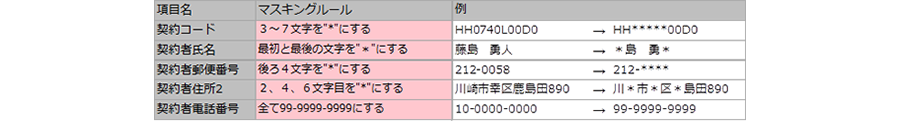 データマート(目的別データベース)とはデータウェアハウスの中から特定の目的に合わせたデータを抽出し、利用部門ごとに利用目的に合ったデータのみを所持するものです。例えば、保険業界やクレジットカード業界では、契約照会システムを構築する際にインプットデータを契約管理システムから連携するケースが一般的です。ただ、契約照会システムではインプットデータ内の個人情報にあたる電話番号や、住所部分についてマスキング処理を行い、契約照会システムの利用者の開示しない形をとられるケースがあります。また、システム構築のテストフェーズで本番データにできる限り近いデータを用意する目的で契約データを利用するが個人情報部分については、マスキングしテスト実施することがほとんどです。このようなデータマスキングを行う場合、多くは「住所の何桁目から何桁目まではマスクする」といったルールはあるがマスキング方法については人手を介すケースもあり、システム化・標準化をしにくいとの課題が存在します。