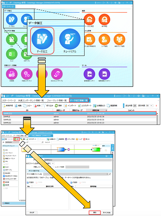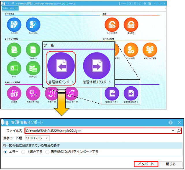 DataMagicではファイルとして保存した管理情報をインポートして実行することが可能です。
