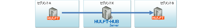 セグメントAとセグメントBが直接接続できないので、セグメントXのHULFT-HUBを中継してファイルを転送する。この場合、ファイル転送は1回で完了する。