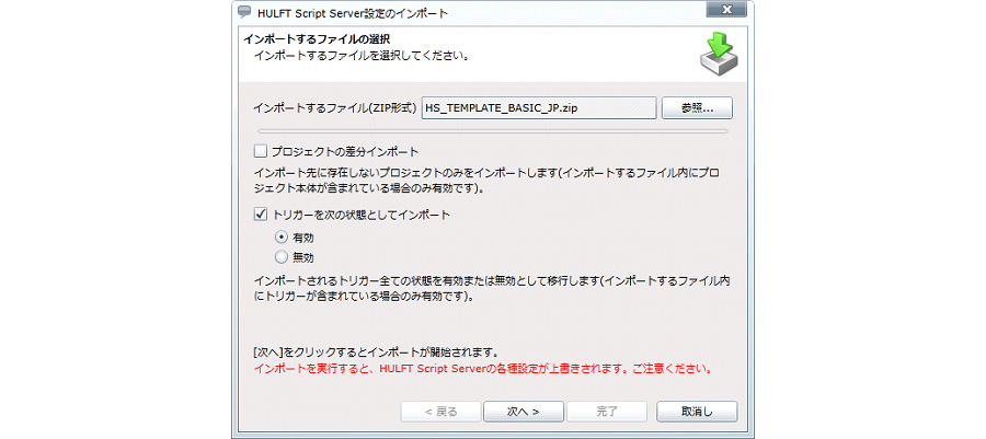 HULFT Scriptにはサンプルスクリプトのテンプレートを提供しております。インストール後、HULFT Scriptの設定画面から[コントロールパネル]-[サーバ移行]でテンプレートのインポートを行ってください。インポート用ファイルは付属の「template」ディレクトリ内に配置されております。 インポート後はHULFT Scriptの再起動が必要になりますので、HULFT Scriptの[コントロールパネル]で再起動を行ってください。