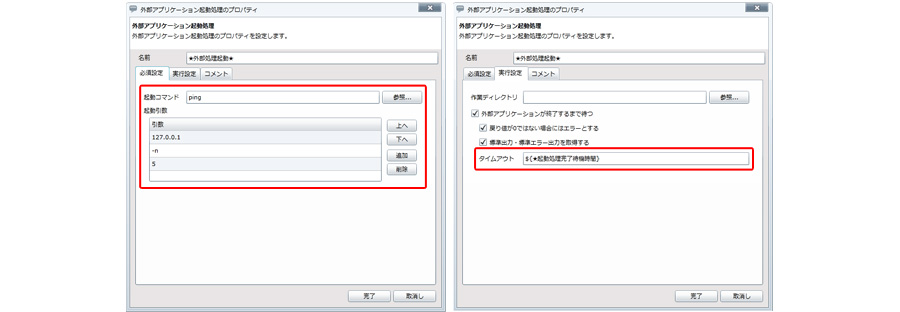 実行するコマンドや実行ファイル、バッチファイルやスクリプトファイルに設定を変更してください。実行時の引数についても変更してください。また、制限時間は[実行設定]タブのタイムアウトに設定しています。