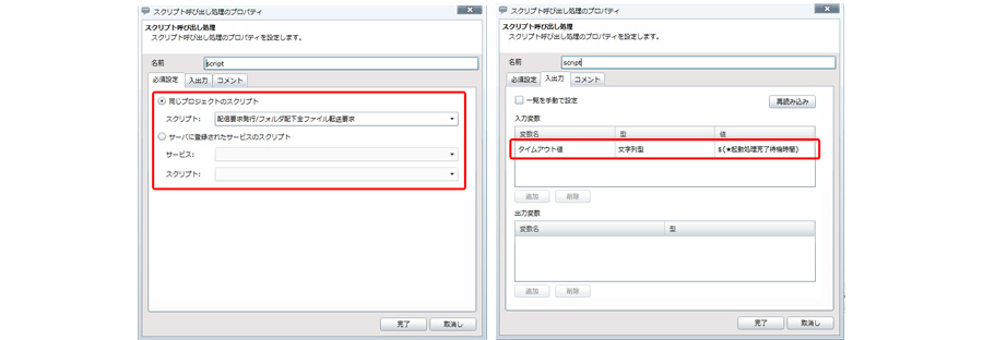 呼び出しのスクリプトを設定します。呼び出されるスクリプトで入力のスクリプト変数を用意しておけば、変数で制限時間を渡すことができます。