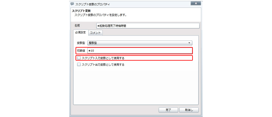 変数の初期値を設定することで、指定した制限時間でタイムアウトするようになります。また、外部のアプリケーションから本スクリプトを呼び出す場合、「スクリプト入力変数として使用する」にチェックを入れておくことで実行時の入力引数に指定することが出来ます。単位については変数を使用しているアイコンや処理によって異なります。初期設定の外部アプリケーション起動の場合、単位はミリ秒になります。