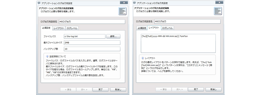 HSログの設定はテンプレートのインポート時に設定されます。設定内容の確認は[コントロールパネル]-[アプリケーションログの出力設定]で確認することができます。ご利用の環境に応じてログの出力先や出力フォーマットを変更してください。