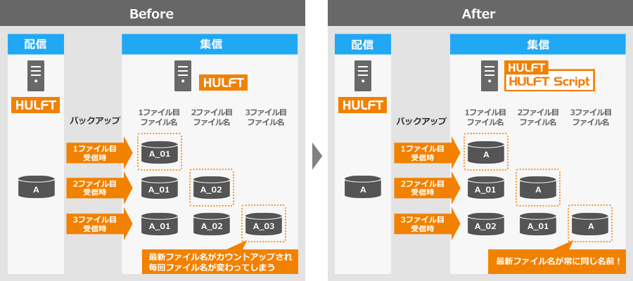 最新のバックアップファイルを常に同じ名前で保存しながら、複数ファイルを世代管理したい場合にお使いいただけます。HULFTの標準機能でも世代管理ファイルが作成できますが、ファイル名につく数字がカウントアップされるため、データを扱う前に最新のファイル名を調べる必要があります。名前が固定されていると、調べる手間が省けるので便利です。