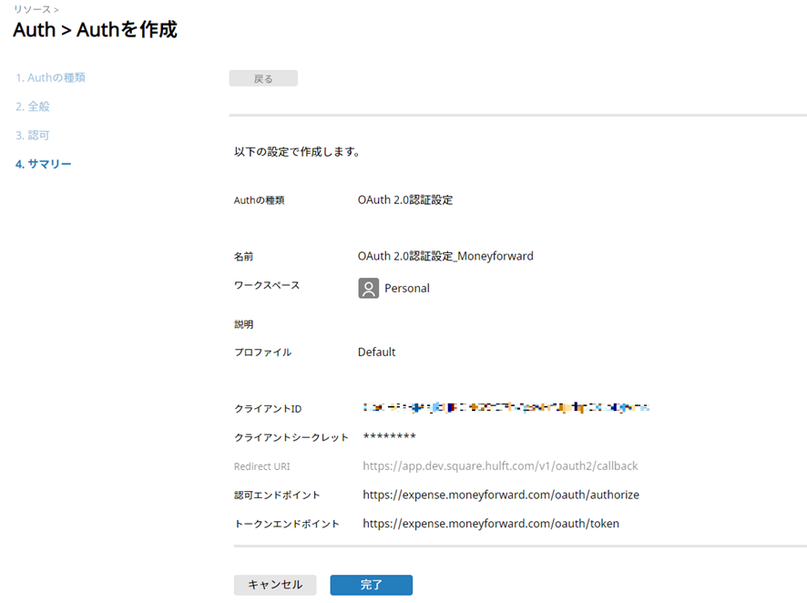 - クライアントシークレット: MoneyForwardで作成したシークレット