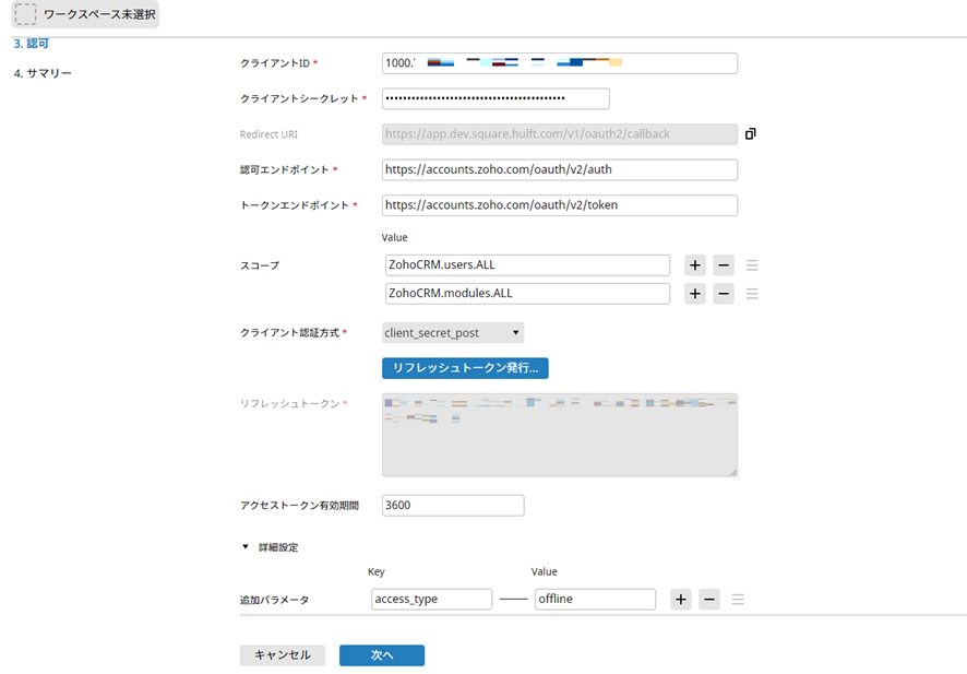 ここまで設定できましたら、リフレッシュトークン発行を押して、リフレッシュトークンを設定してください。