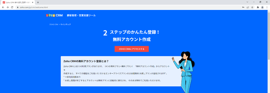 なお、Zoho CRMのユーザアカウントができていることが前提となります。Zoho CRMのユーザアカウントがない場合は以下のリンクより作成してください。