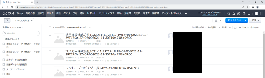 指定したZoho CRMへ取引先情報が登録されていることが確認できます。