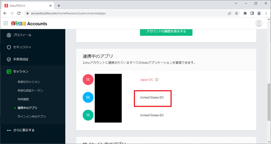 - 作成したアプリケーションの地区名を確認します。名前部分をクリックして「My Account」を押してください。Account画面が表示されましたら、左側の「セッション」→「連携中のアプリ」を選択して、連携したいアプリのApp's data center (Japan DC,United States DC…)の値を確認してください。後でHULFT Squareの設定で使用します。