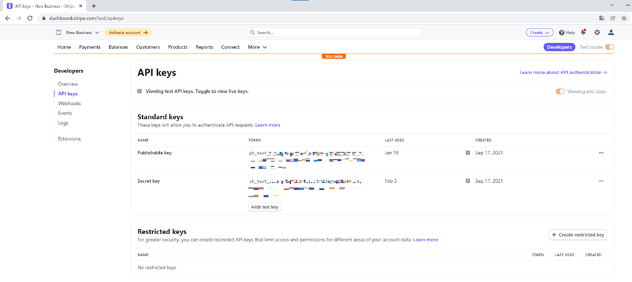 まずは、Stripeから連携に必要な情報を取得していきます。