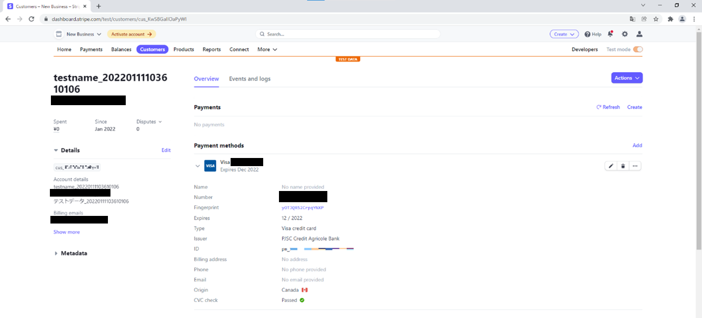 指定したStirpeの顧客に支払方法の情報が追加で紐づいているか確認してください。