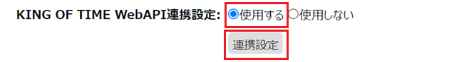 左側の設定タブから[その他]→[オプション]→[外部サービス連携]→[KING OF TIME WebAPI連携設定]で[使用する]を選んで[連携設定]をクリックします。