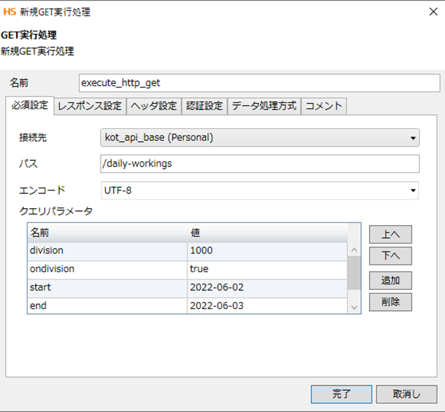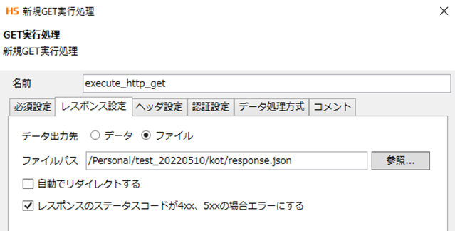 以下の設定だと、HULFT Squaeのストレージの[/Personal/test_20220510/kot]ディレクトリに[response.json]の名前で取得した勤怠情報のファイルが生成されます。
