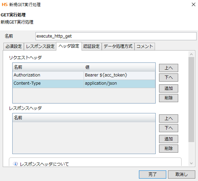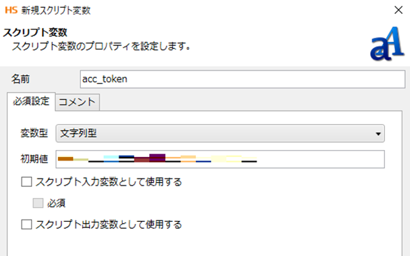 変数名は[acc_token]、変数型は文字列を指定して、値には先ほど取得したアクセストークンの値を入力して[完了]を選択します。