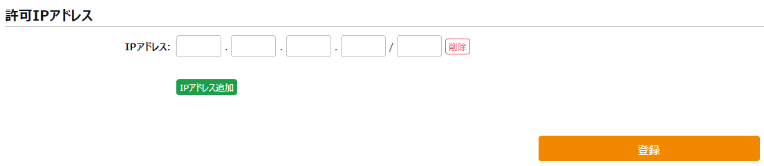 - 許可IPアドレス:APIにアクセス可能なIPアドレスを指定します。単一ホストをIPの場合は/0、その他の場合はネットワーク部の桁数を入力してください。(ex. 255.255.255.xxx/24)