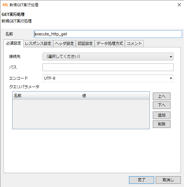 次に右のメニューから[ネットワーク]>[REST]>[get実行]をスクリプトにドロップします。表示された設定画面に設定を入力していきます。