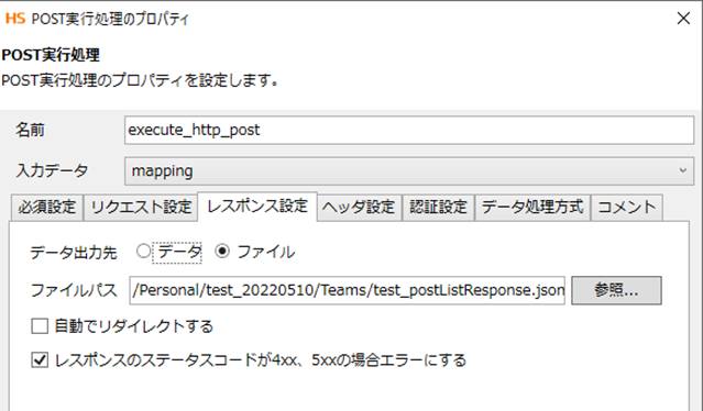 任意の設定で問題ありません。ここではサンプル用にレスポンスデータをファイルに出力するようにしています。