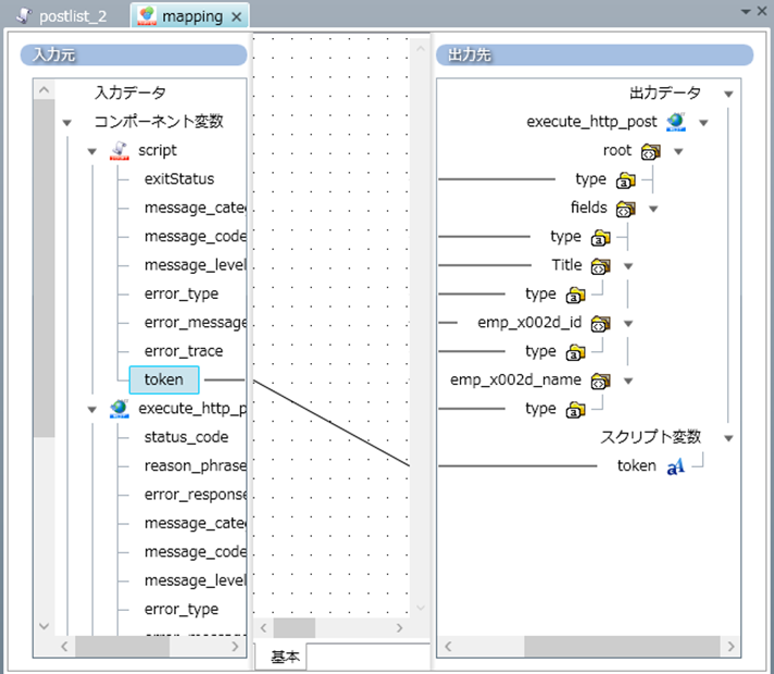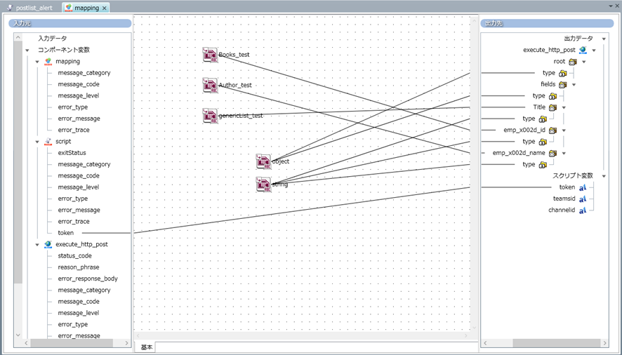 POST実行コンポーネントの手前にmapperコンポーネントを配置して、TeamsのLists機能に送りたいデータをマッピングします。マッピング内容は、ユーザーの要望と環境に沿って任意で設定してください。