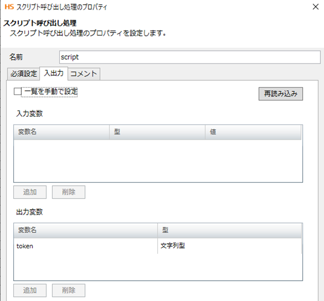スクリプト呼び出しコンポーネントを設定しましたら、出力変数で出力されるアクセストークンをこのフローのスクリプト変数にマッピングします。ここでは同名のスクリプト変数「token」を作成しています。