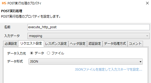 ※すでにリクエストJSONデータのサンプルがありましたら「JSONファイルを指定して入力スキーマを設定」を利用してリクエストJSONのテンプレートを指定することができます。