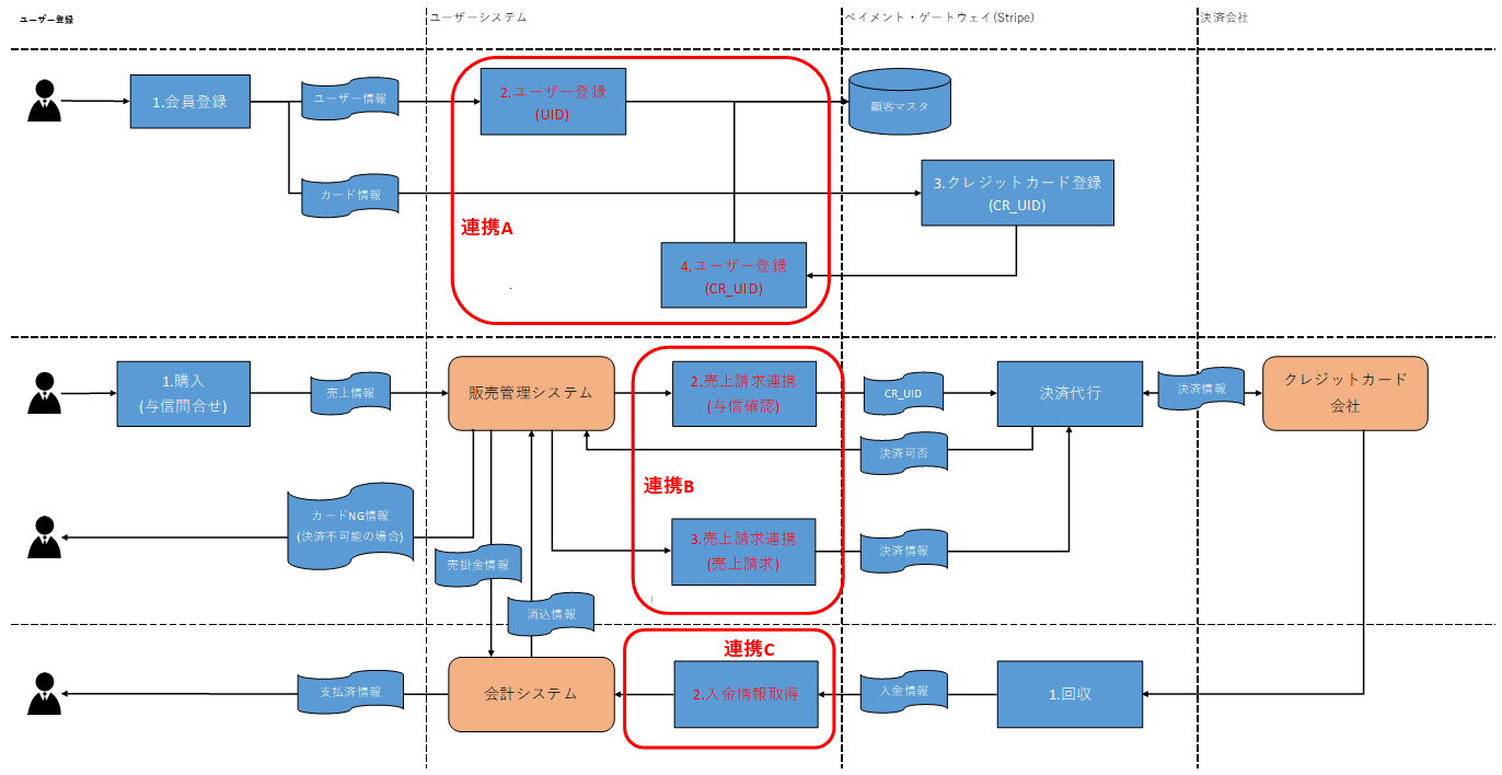これまでの内容で、連携BでStripeにあげた売上請求を、Stripeが連携Aで登録したユーザーに対して実際に回収するところまでが実現できています。