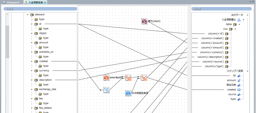 手順①で取得したレスポンスデータはJSON形式ですので、この情報をCSV形式に変換します。変換には、Mapperコンポーネントを利用し、手数料情報と実際の入金額を別レコードとするため、JSONデータを要素ごとに繰り返します。