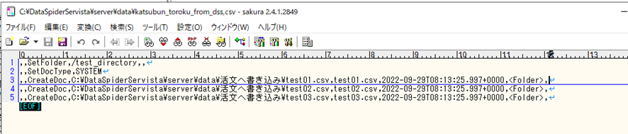 今回は1行目、2行目を環境で固有の値として前もって作成しておき、3行目以降を登録したいファイル名を DataSpider で収集する形で追記します。