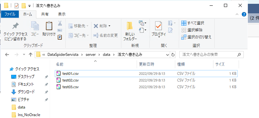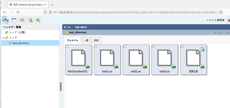 以上の内容で2本のスクリプトの作成が終わりましたら、①のスクリプト実行後に②のスクリプトを実行すれば、「test01.csv」「test02.csv」「test03.csv」(「C:\Program Files\DataSpiderServista\server\data\活文へ書き込み」に収集されていたファイル)が活文の「test_directory」上に追加登録されているはずです。