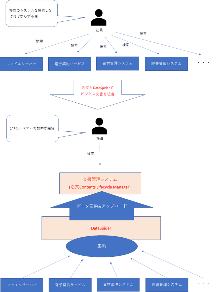 DataSpiderで連携スクリプトを準備することで、ビジネス文書の全てを活文に連携し、外部サービスに保存されてしまっていた契約文書なども含めて社員が活文で検索できるようにします。